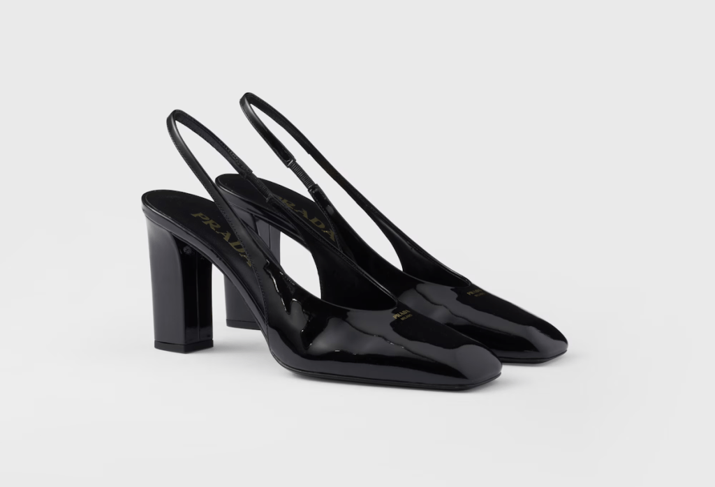 These slingback pumps embody practical elegance, where simple forms meet the refined touch of patent leather. The screen-printed lettering logo enhances the modernist design (Priced at $1,200.00).