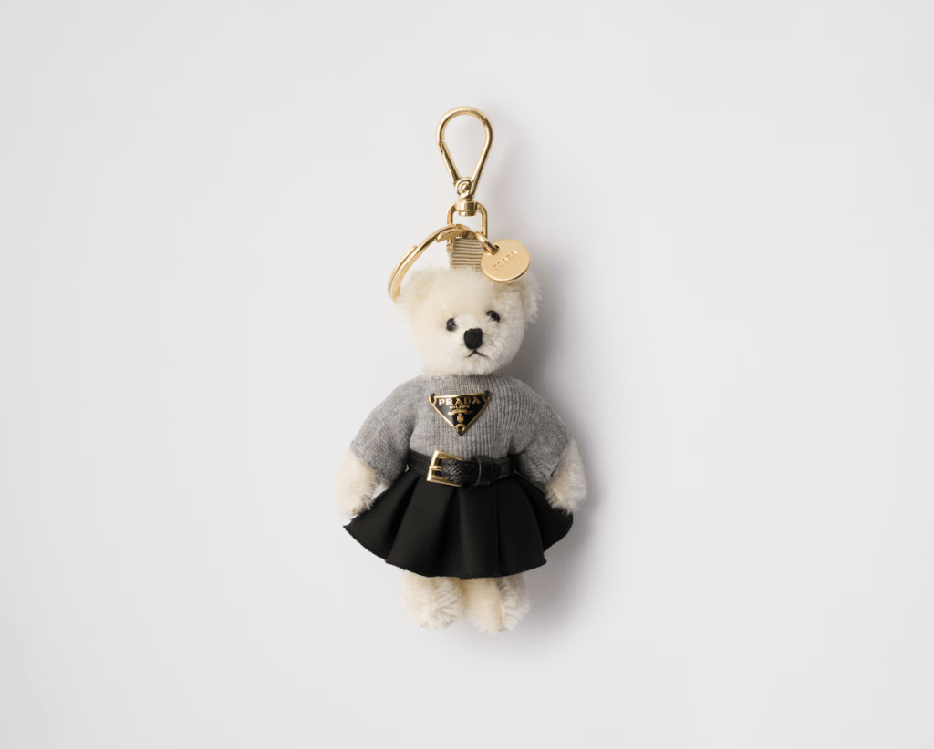 This plush charm, a playful accessory for your bag, becomes the symbol of contemporary style with a gray top and nylon skirt (Priced at $750.00).