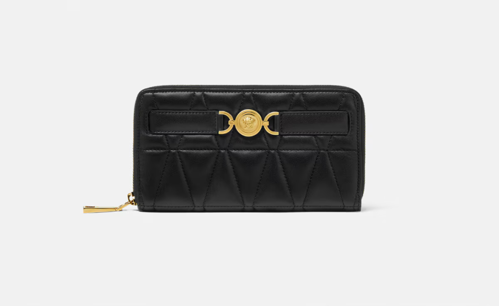 A zip-around long wallet crafted from soft nappa leather featuring a V-quilting design, accented by the signature Medusa ’95 hardware. The accessory features multiple card slots, note compartments and a zipped pocket (Priced at $725.00).