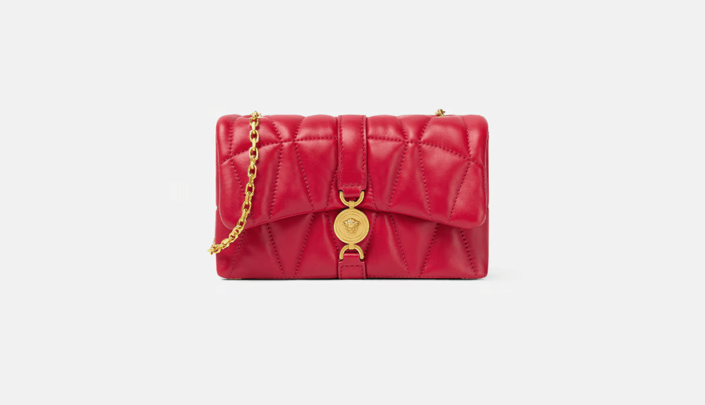 The Kleio crossbody mini bag crafted from quilted nappa leather. Soft pillow-like appearance and feel. Characterized by the signature Medusa ’95 closure. Enriched by a removable chain strap (Priced at $1,390.00).