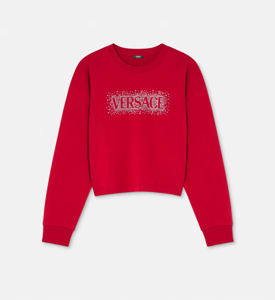 This regular-fit crewneck sweatshirt is made from cotton jersey and features a crystal-studded Versace logo in a starry sky motif, ‘Cielo Stellato’ in Italian (Priced at $1,295.00).