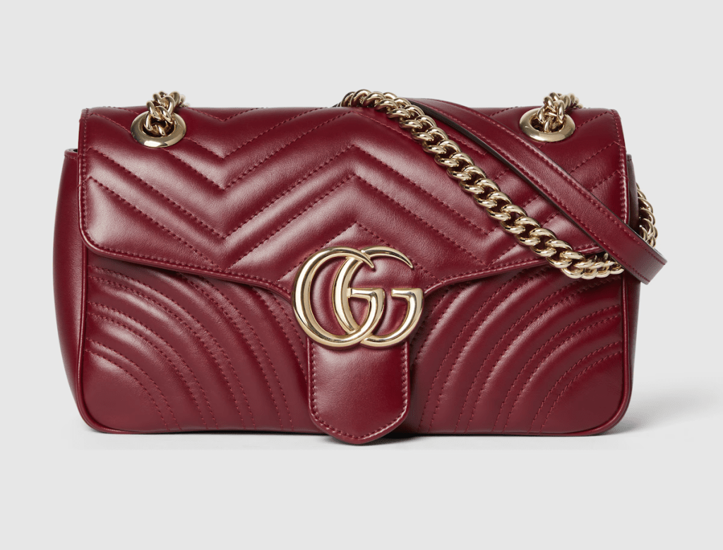 This small shoulder bag presents the GG Marmont style in a signature color, complete with light gold-toned hardware and ivory leather lining (Priced at $2,850.00).