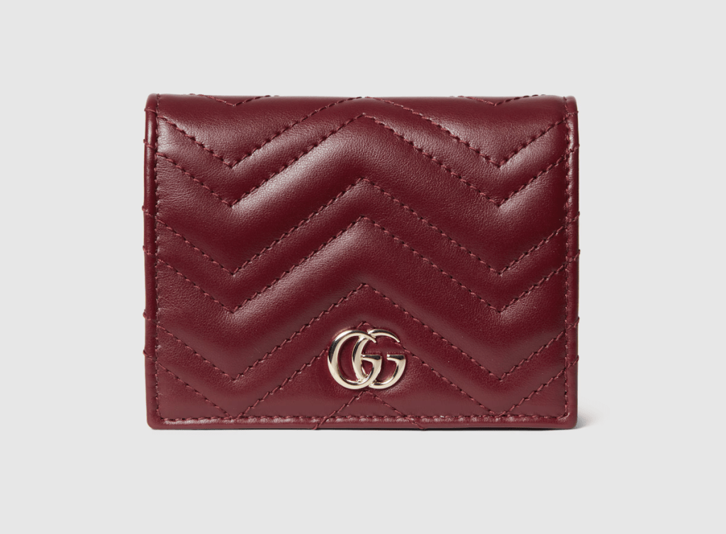 This GG Marmont foldable card case is crafted from Rosso Ancora red matelassé chevron leather. The signature hardware in a lighter gold-toned defines this accessory, complete with five card slots (Priced at $540.00).